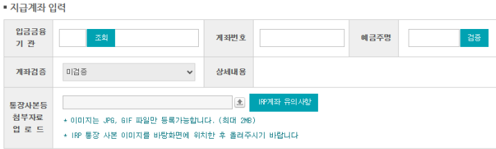 퇴사자의 IRP 계좌 정보를 입력하시면 됩니다. 퇴사자에게 받아놓은 IRP 통장사본을 이미지 파일(JPG)로 업로드합니다.