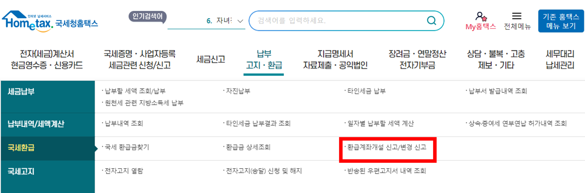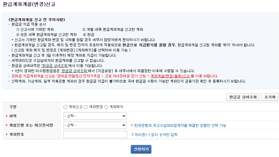 1. 홈택스(http://www.hometax.go.kr) 접속후 [납부 고지/환급] → [국세환급] → [환급계좌 개설 신고/변경 신고]