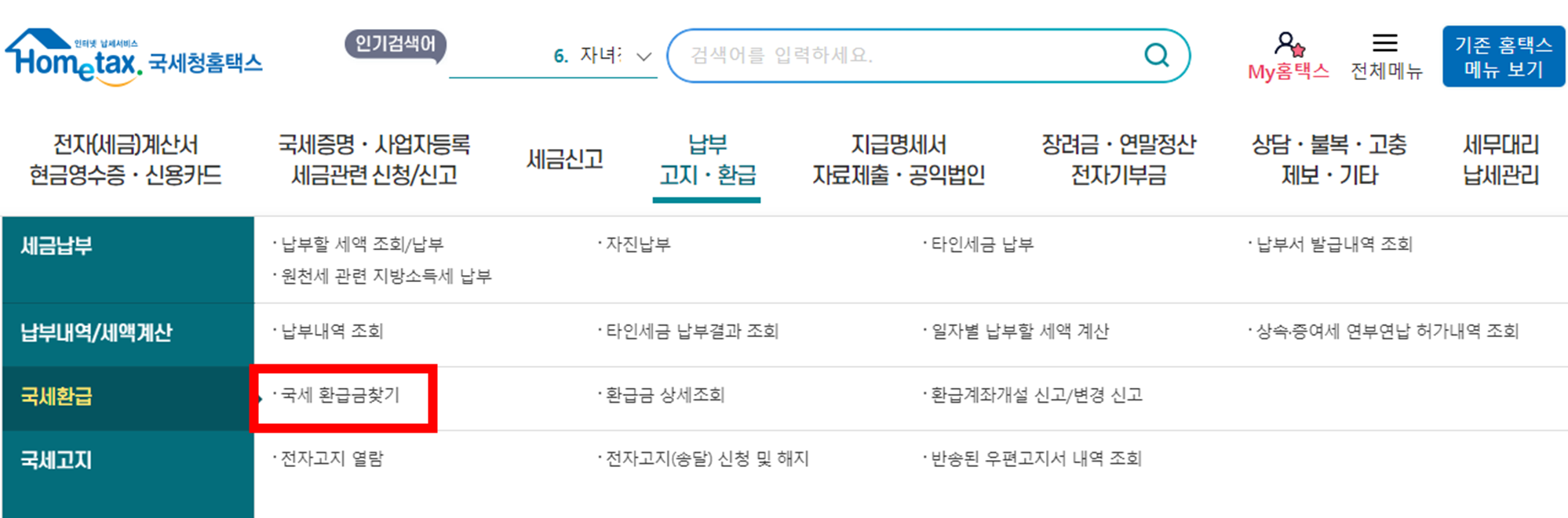 1. 홈택스(http://www.hometax.go.kr) 접속후 [납부 고지/환급] → [국세환급] → [국세 환급금 찾기]
